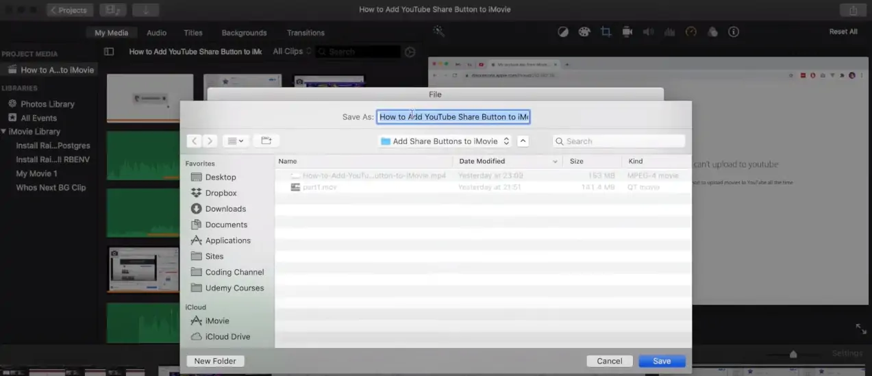 V dolní části dialogového okna uvidíte tlačítko Další. Klikněte na něj. Zobrazí se možnost „Uložit jako“ a sekce, kam můžete zadat název souboru. Zadejte požadovaný název pro váš iMovie a v pravém dolním rohu dialogového okna klikněte na „Uložit“.
