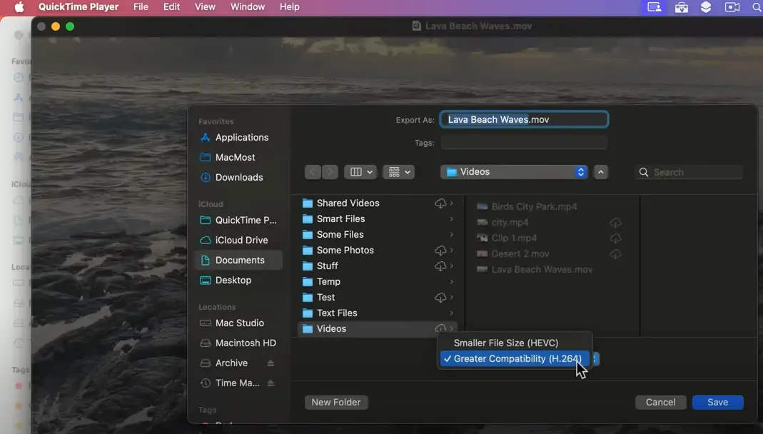 iMovie můžete v QuickTime převést na MP4 změnou přípony z .MOV na .MP4. Protože iMovie ve výchozím nastavení ukládá filmy ve formátu .MOV, film se v QuickTime přehraje. Stačí změnit typ kontejneru z .MOV na MP4.