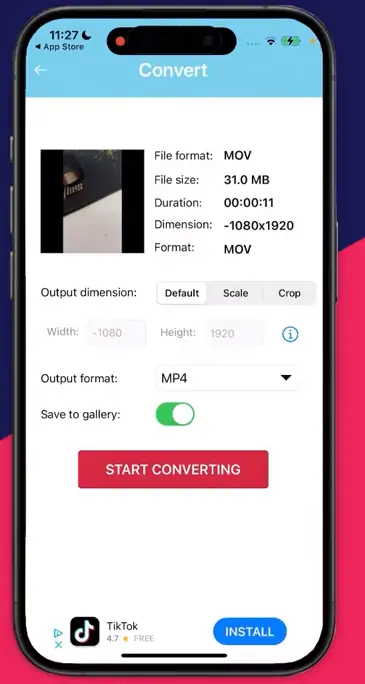 5. Vedle položky „Výstupní formát“ vyberte MP4. Zkontrolujte, zda je tlačítko vedle položky „Uložit do galerie“ v poloze „Zapnuto“, a poté klikněte na „Spustit převod“. Video se spustí převod z MOV do MP4.